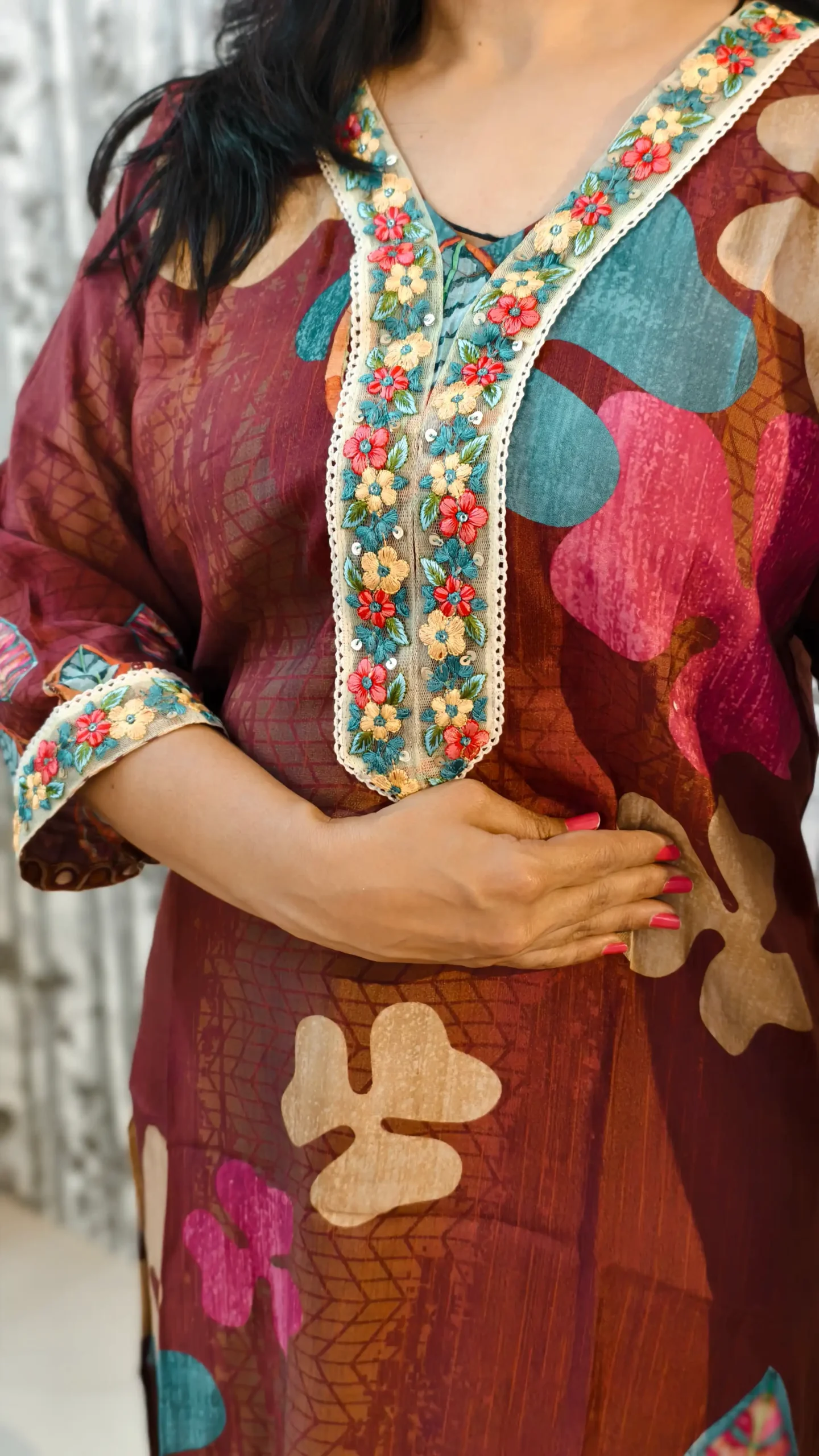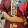 - Kurti Color: Deep maroon base with multicolor floral and geometric accents