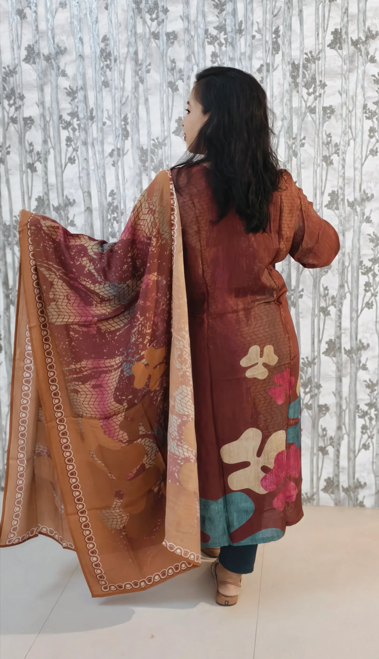 Floral Red Brown Muslin Kurti with Dupatta – 2 Piece Set
